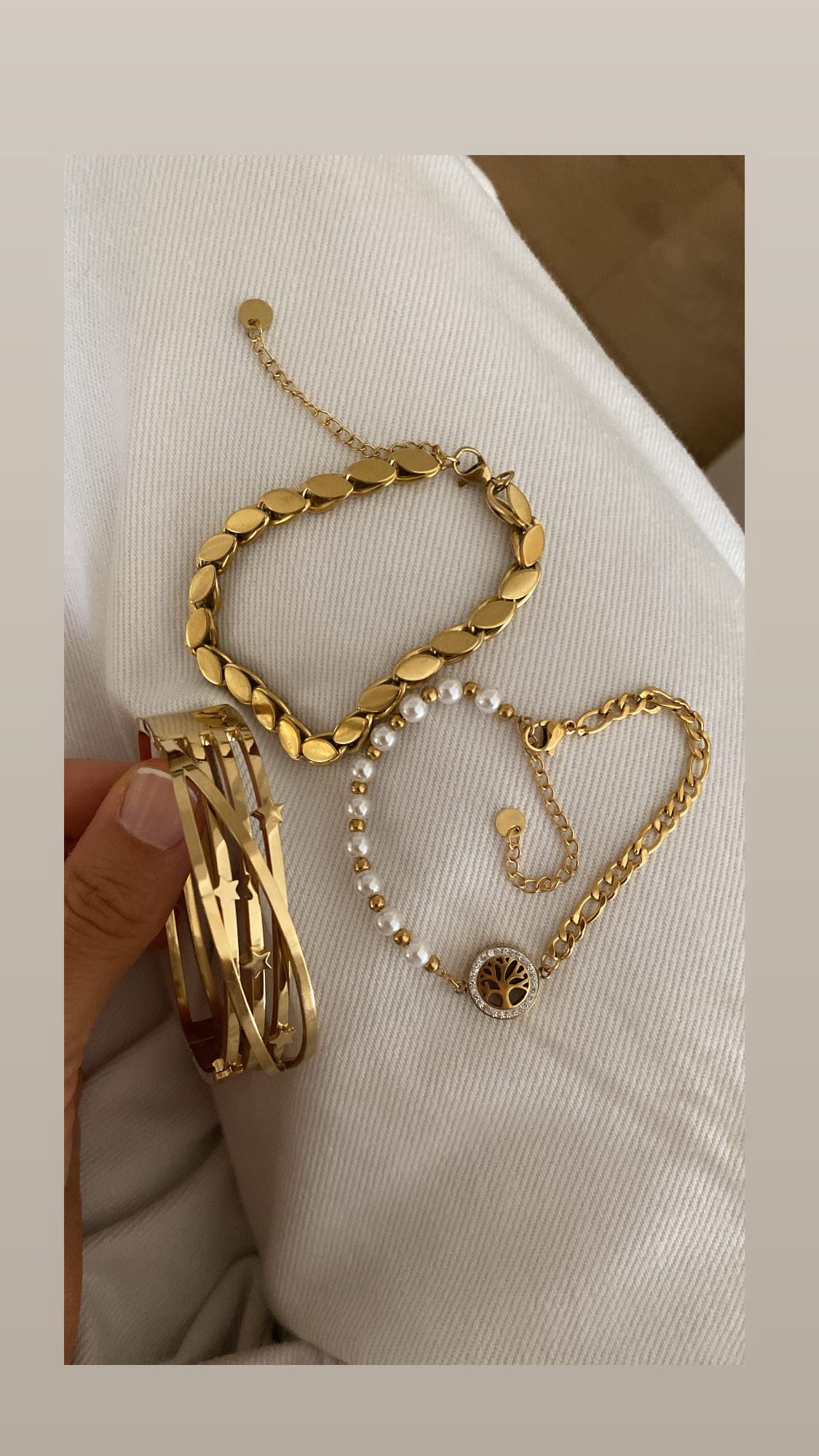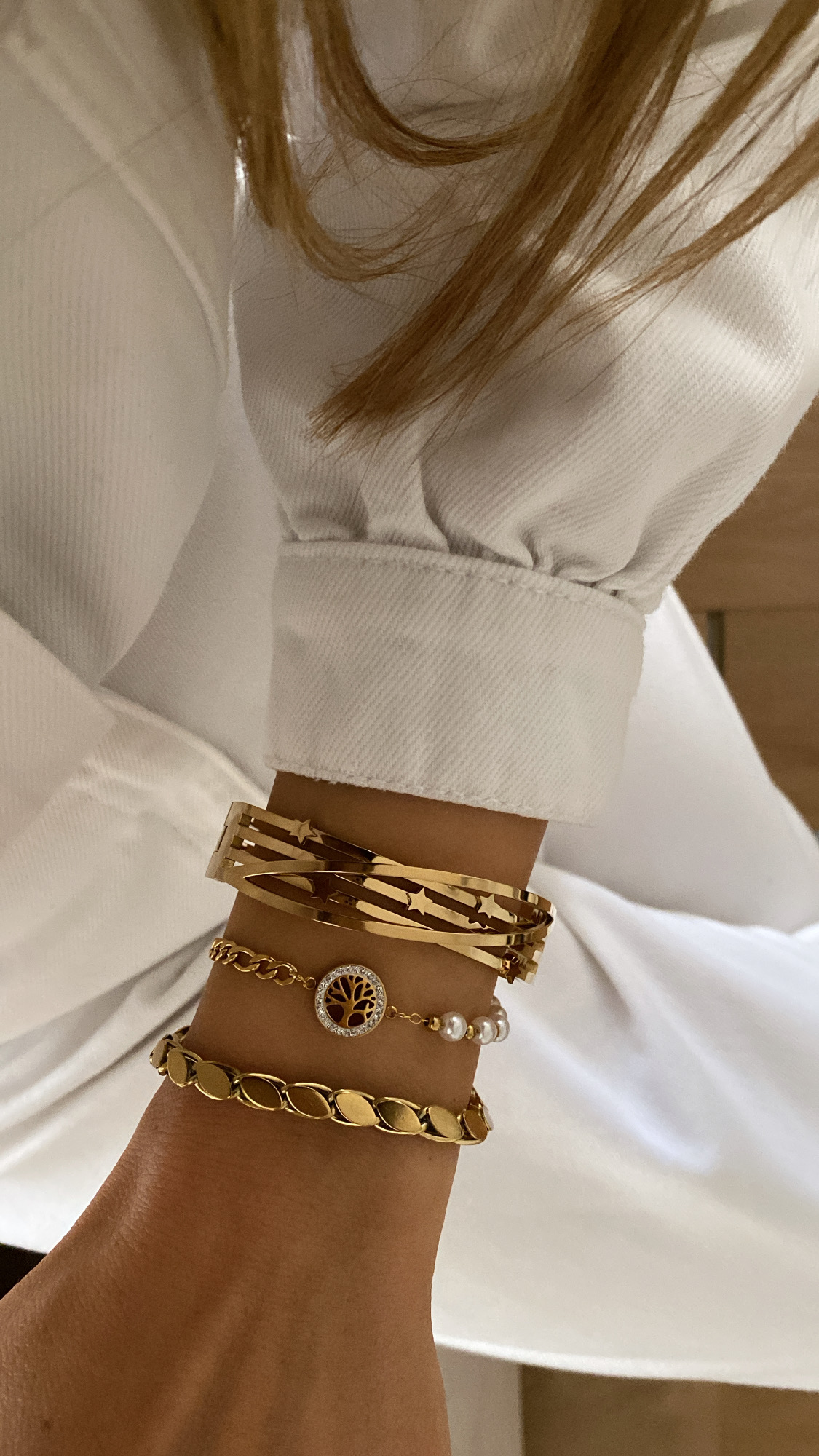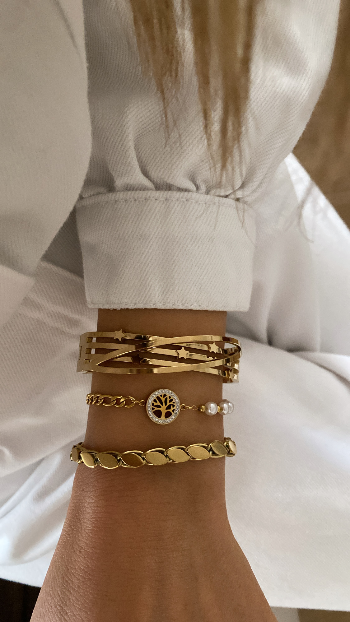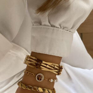 Yıldız Detay Kelepçe – İnci Detay Hayat Ağacı Model – Arpa Model Gold Çelik Bileklikler